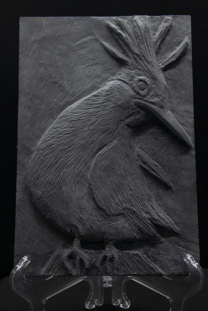 Stellar Day is a relief carving of a Steller’s Jay, carved in slate. The bird is presented in profile, allowing the sharp beak, alert eye, and raised crest to define its character. Subtle texturing in the feathers contrasts with the natural, matte surface of the slate, giving the piece quiet depth without distracting from the form.