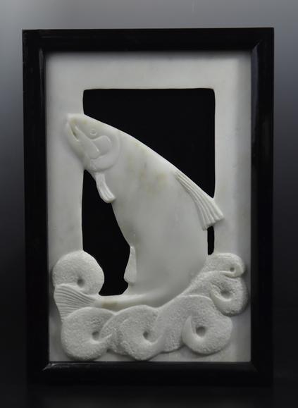 The smooth, pale marble contrasts with the darker frame and granite backing, giving the piece visual depth and a quiet sense of balance. Fine carving details in the fins and head are paired with softer, textured elements below, reinforcing the moment of transition between water and air.